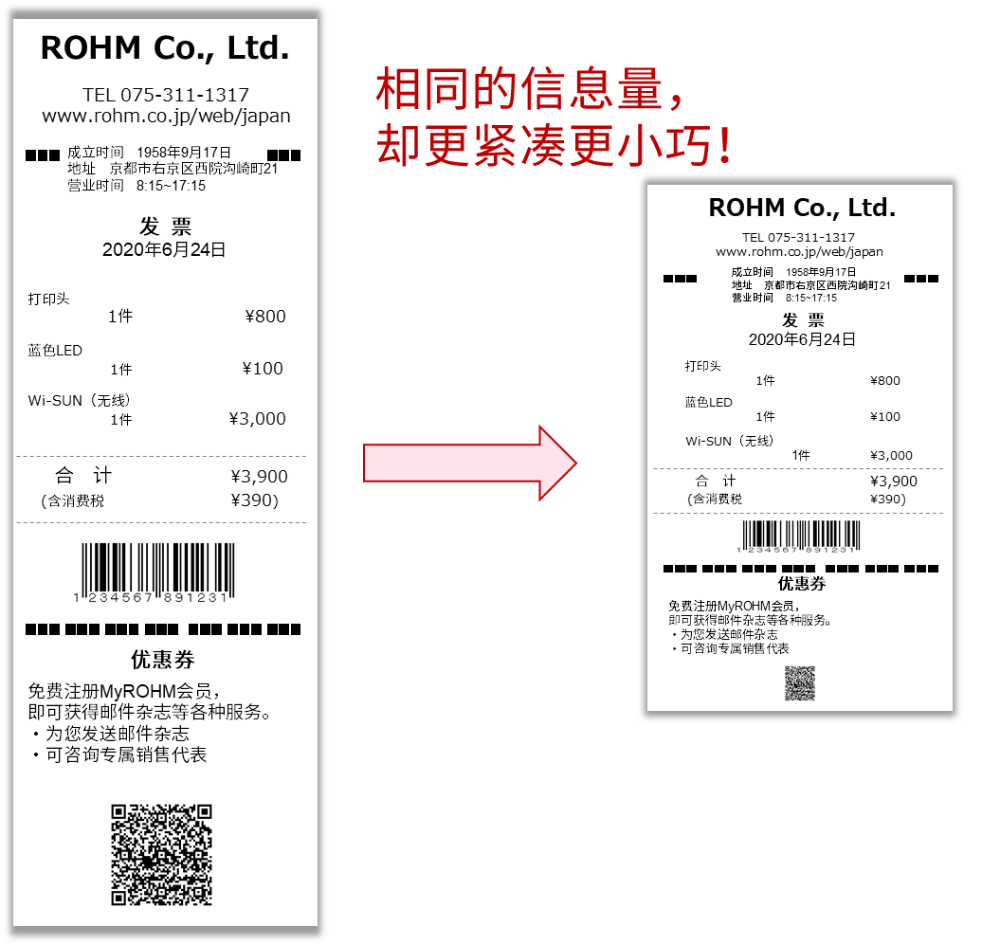 而如果使用ROHM正在开发的600dpi打印头,则可以在相同空间中打印三倍的信息量,或者仅用原来1/3的空间即可打印相同的信息量。