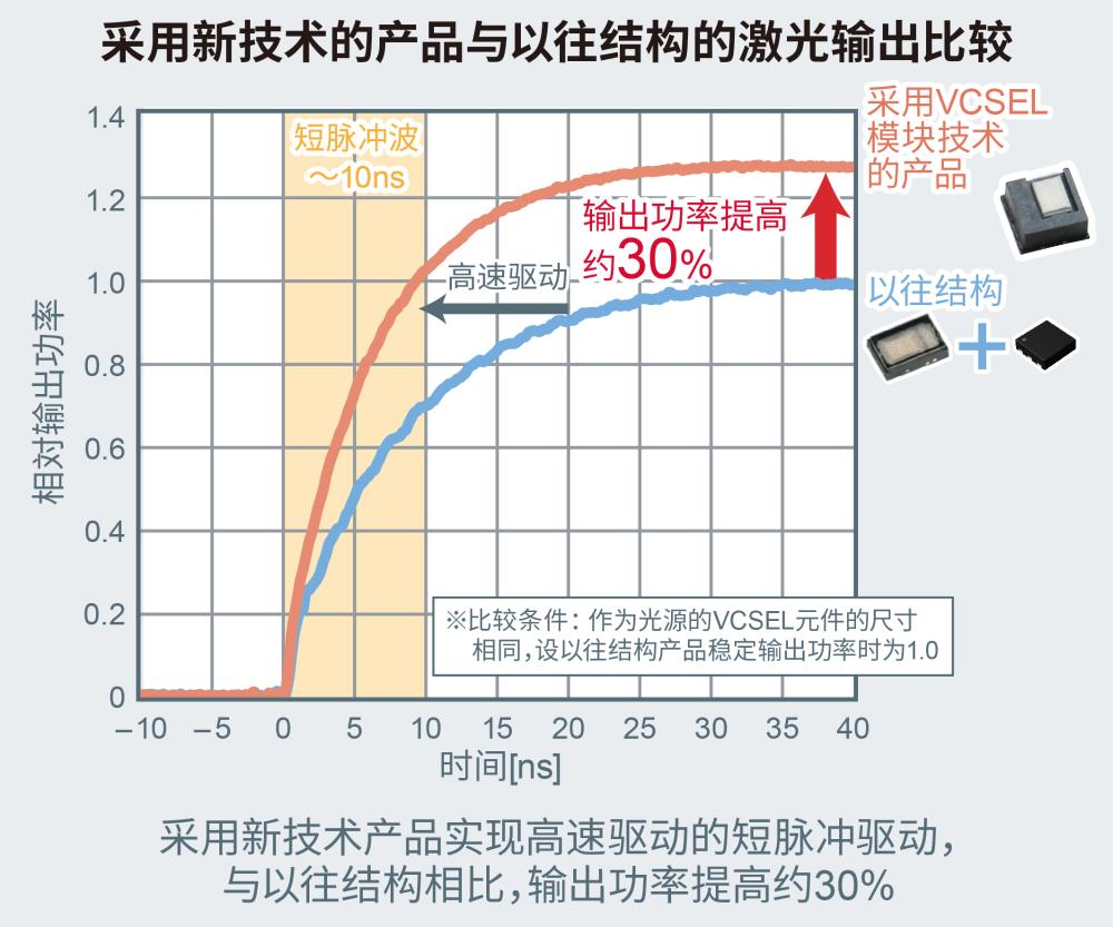 该技术是通过适当的形式将ROHM开发的MOSFET元件和模块用的新VCSEL元件一体化封装来实现的。不仅能够更大程度地发挥出元件的性能,而且尽可能地降低了元件间与电路的布线长度成正比的寄生电感,从而使高速驱动和更高输出功率成为可能。由此,即实现了不易受阳光干扰影响的短脉冲(10纳秒以内)驱动,又使输出功率提高了约30%(与以往未模块化的结构相比)。