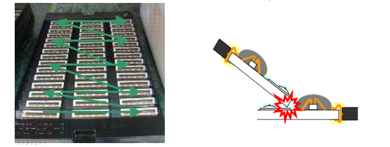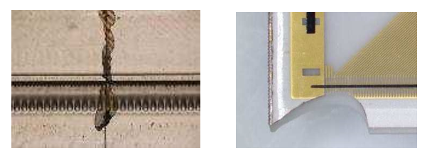 切勿伤及TPH表面的线路和IC保护树脂,不要沾上硬物比如焊锡的碎屑,螺丝碎屑,陶瓷粉尘等,如果用沾上硬物的打印头进行打印,硬物很有机会会随着热敏纸把TPH给划伤了(下左图),组装完成之后建议用棉棒蘸酒精清洁打印头表面。放热板贴装时,不要让打印头单边·单点受压,陶瓷片有可能会碎裂(下右图)。