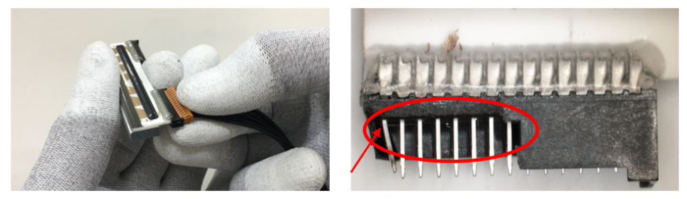 接口对水平的插拔有一定的耐力,但对上下的作用力比较脆弱,插拔的时候水平和垂直角度不要超过±30度,关于力度如果是7pin尽量控制在44N以下,15pin就控制在83N以下(见下左图),蛮力会导致接口有下右图的悲惨遭遇。接口损坏会直接导致的接触不良,进而影响打印。