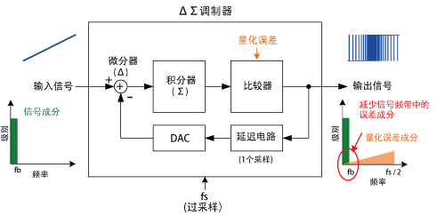 通过将输出数据延迟1个采样周期并反馈至输入进行调制,使比较器产生的量化误差在低频区域较小,在高频区域较大。