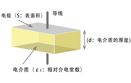 (εr:电介质的相对介电常数, ε0:真空介电常数=8.9×10-12[F/m], S:电极的表面积, d:电介质的厚度)