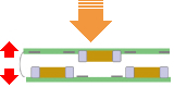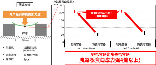 树脂模具结构的钽电容器具有电路板弯曲应力强的优点。可以贴装于弯曲剧烈的电路板边缘,提高电路板设计自由度。另外,制造工程中操作电路板时也不用像陶瓷大容器一样注意许多事项。