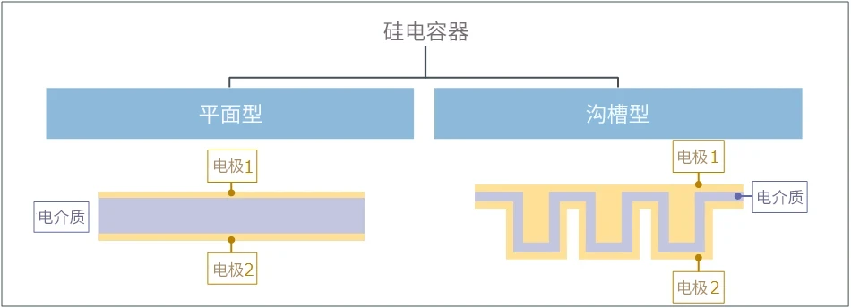 硅电容器按内部结构可以分为平面型和沟槽型两类。