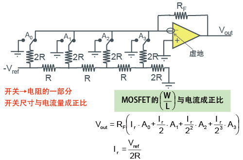 缺点是为了电阻的高相对精度,在实现高精度时需要对开关(MOSFET的尺寸)和布局(R和2R的匹配性很重要,特别是MSB侧=AO侧的电阻必须准确制作)下功夫。