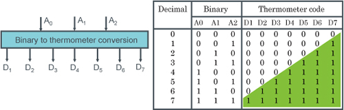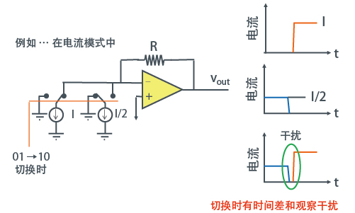 数据切换的瞬间,完全不同的电压(或电流)输出,在输出模拟信号中产生噪声。这个噪音叫做干扰。这个干扰的解决方案之一是使用温度计码(Thermometer code)。