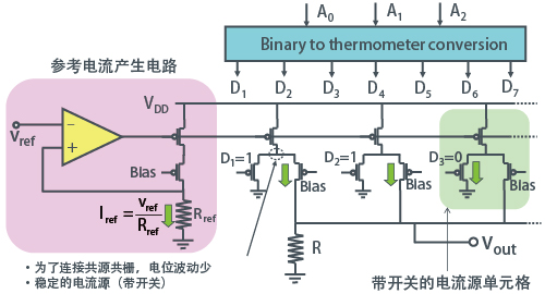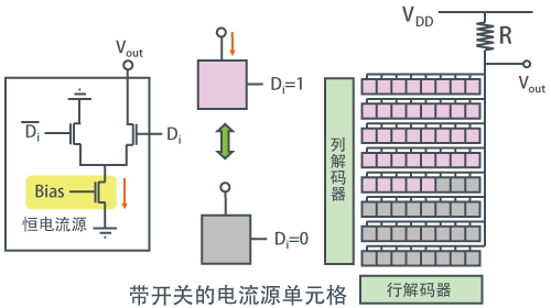在若干单元格中拉动电流时决定了输出 电压Vout电流型DAC。