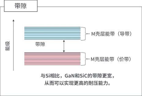 宽带隙半导体GaN和SiC需要比Si更高的热能才会发生电子跃迁。因此,GaN和SiC可以实现更高耐压。
