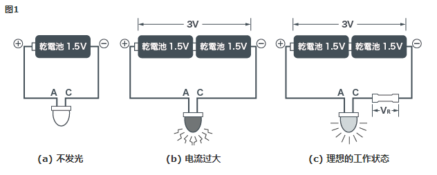 要使LED(发光二极管)发光,需要通过限制流过电路的电流,使施加于LED的电压值变为适当的值(约2V)。如图1-(a)所示,只是直接连接1节干电池(约1.5V)时,因电压不足而无法发光。
