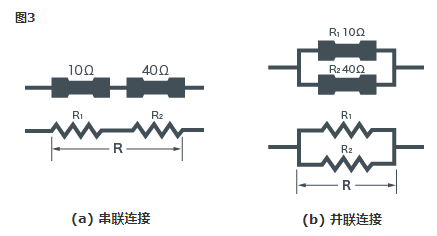 电气电路的连接大体上可分为串联连接和并联连接,如图3所示。连接多个电阻器时,串联连接和并联连接其合并电阻值各不相同,阻值如下。