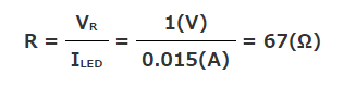 若LED流过的电流ILED为15mA (1mA=1/1000A),根据欧姆定律,电阻值R如下…