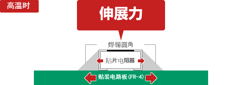 厚膜贴片电阻以氧化铝电路板为支撑, 与贴装电路板的代表性材料FR-4(玻璃环氧树脂),在温度变化引起的收缩度(热膨胀系数)方面有差异。重复温度循环时,该差异转变为应力,在结合两者的焊锡圆角接合处可能产生裂纹。