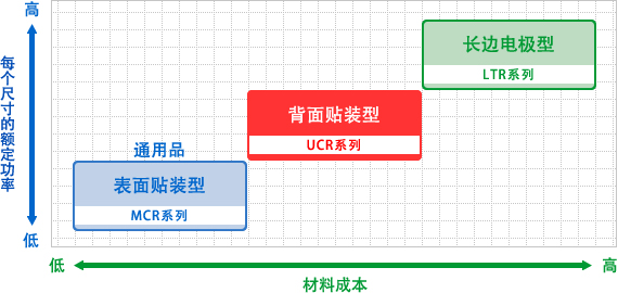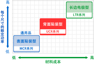 长边电极型是通过增大电极尺寸来提高散热性,保证高额定功率的产品。但是,由于电极材料的增加等,与相同尺寸的通用品相比,成本方面处于劣势。