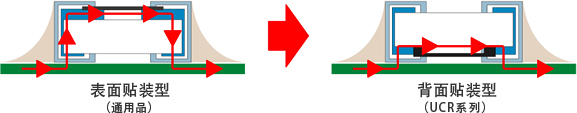 UCR系列采用了背面贴装结构。背面贴装结构缩短了电路板与散热点的距离,提高了散热特性。 另外,UCR系列除了采用背面贴装结构外,还对材料和结构进行了重估。这样,可保证比通用低阻值高的额定功率,对应用的小型化作出贡献。