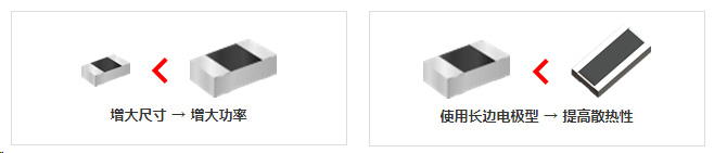 低阻值电阻器不仅可正确显示电阻器的阻值,还是小型、大功率产品或散热性优良的产品所必不可少的。 为了应对大功率或提高散热性,一般使用较大贴片尺寸的产品或长边电极型产品。