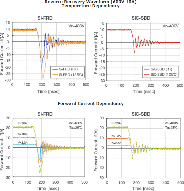与此相反,SiC-SBD是不使用少数载流子进行电传导的多数载流子器件(单极性器件),因此原理上不会发生少数载流子积聚的现象。由于只产生使结电容放电程度的小电流,所以与Si-FRD相比,能够明显地减少损耗。