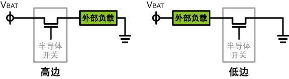 相对于外部负载,将半导体开关配置在上侧电路(电源侧)的叫作高边驱动,配置在下侧电路(GND侧)的叫作低边驱动。