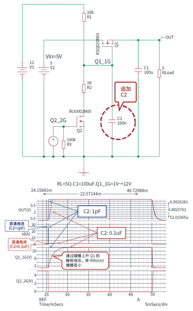 - Q1 ON时,由于会流过浪涌电流,所以作为应对措施追加C2。