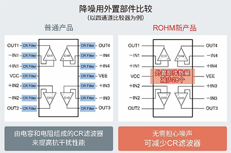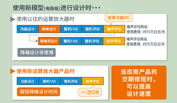 利用源于划时代设计的出色抗EMI性能,不再需要以往所需的外置CR滤波器和金属板屏蔽结构,有助于节省空间和外围元器件的成本。另外,以往在进行降噪设计时,如果功能设计或降噪设计后的噪声评估结果NG,就需要从头开始重新设计,这在时间、精力和成本方面都是一个沉重的负担。而如果使用ROHM抗EMI性能出色的运算放大器,则可以大大减少设计工时和设计成本,有助于缩短应用产品的交货时间。
