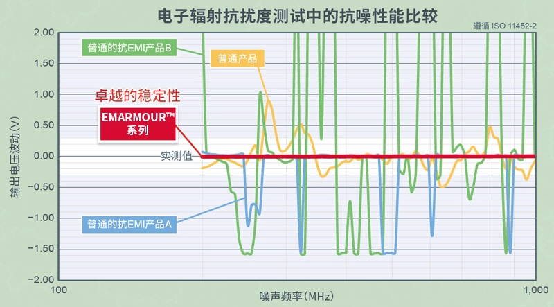 如下方的输出电压波动与噪声频率之间的关系图所示,普通产品和普通的抗EMI产品在某些频率均检测到了易受噪声干扰的峰值,而ROHM的EMARMOUR™系列在不同频率下的波动非常小,从而成功地将输出电压波动抑制在±1%以内(普通产品为±3.5~10%)。
