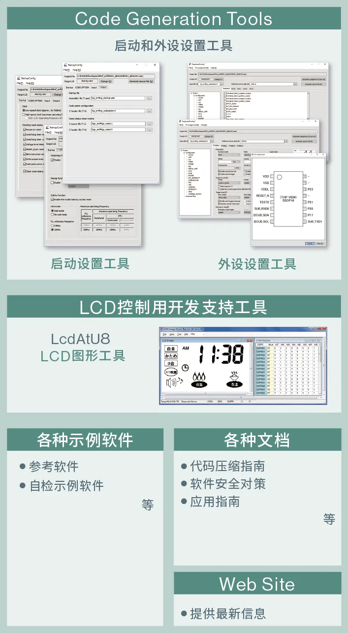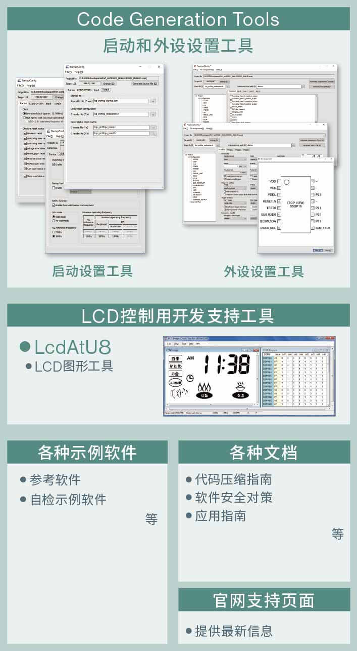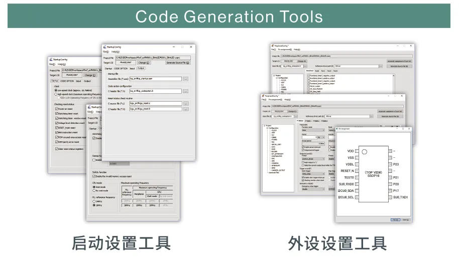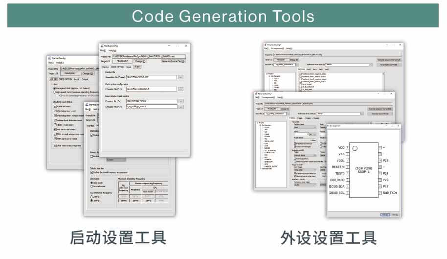 - Code Generation Tools(代码生成工具)是用来生成微控制器工作模式设置和外设初始设置等所用代码的工具。仅需在工具中设置相应的值,即可立即生成可确认运行情况的代码,因此使用该工具可以高效地开发程序。