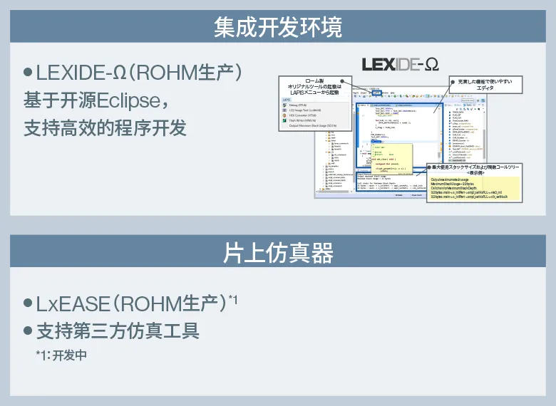 - LAPIS Development Tools LEXIDE-Ω是ROHM微控制器用的应用程序开发环境。适用于搭载ROHM自有的8位RISC处理器nX-U8/100内核、16位RISC处理器nX-U16/100内核的微控制器、以及搭载Arm® Cortex®内核的微控制器。