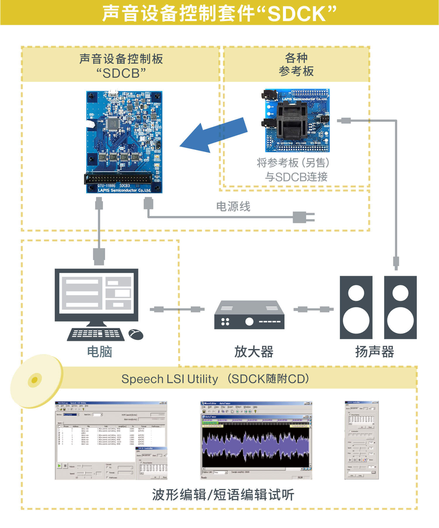 用来将数据通过下面的硬件SDCB写入参考板上的语音合成LSI并试听的工具。可以通过GUI(图形用户界面)的形式轻松处理要发送给语音合成LSI的命令。