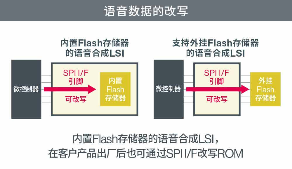 "内置Flash存储器的产品"和"支持外挂Flash存储器的产品"可以通过微控制器的SPI I/F来改写语音数据。
