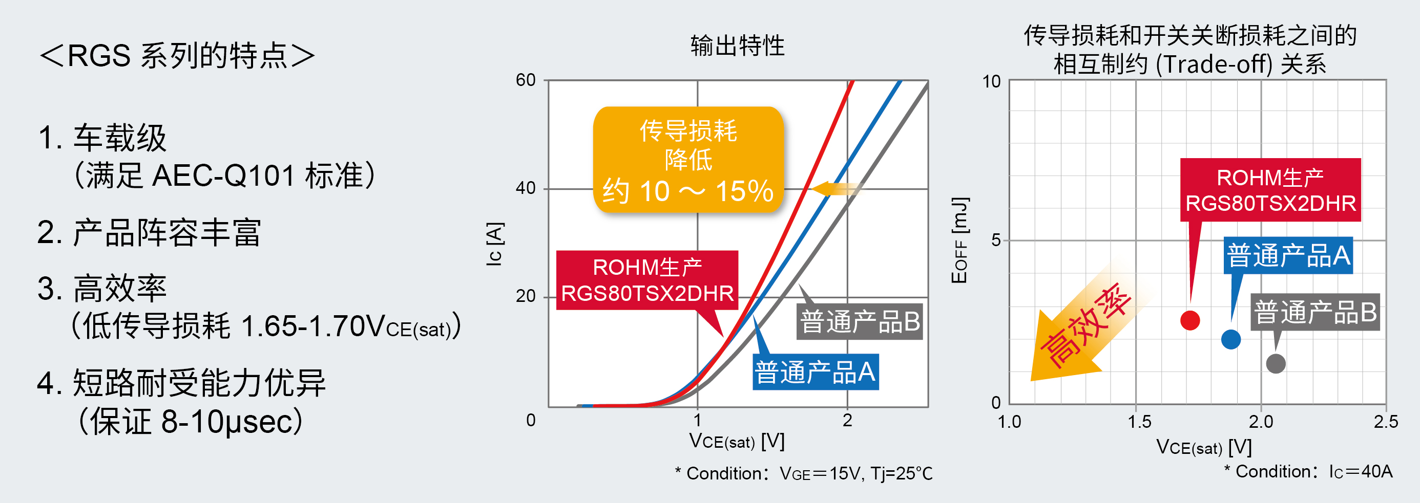 在这种背景下,ROHM开发出满足汽车电子产品可靠性标准AEC-Q101的1200V耐压产品,与650V耐压产品共同构成了丰富的产品阵容。RGS系列实现了低传导损耗(Vce(sat.)),非常有助于应用的小型化和高效化。此外,1200V耐压产品的短路耐受※5)时间为10μsec(Tj=25℃),即使在要求高可靠性的车载领域也可放心使用。