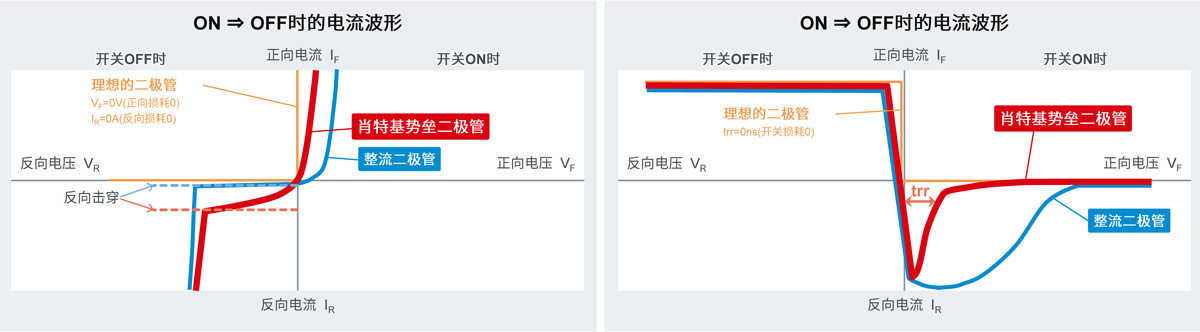 图2. 在开关期间SBD和整流二极管的VF、IR比较