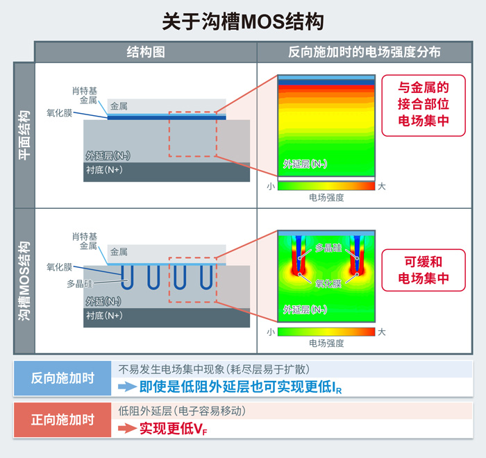 RBLQ系列和RLQ系列采用罗姆自有的沟槽MOS结构,与耐压和耐受电流同等的以往产品相比,VF降低了约15%,可以降低在整流应用等正向使用时的功率损耗。此外,与以往的平面结构产品相比,IR也降低了约60%,这可以大大降低SBD最让人担心的热失控风险,从而使产品也可以用在温度条件等非常严苛的车载应用中(图6)。