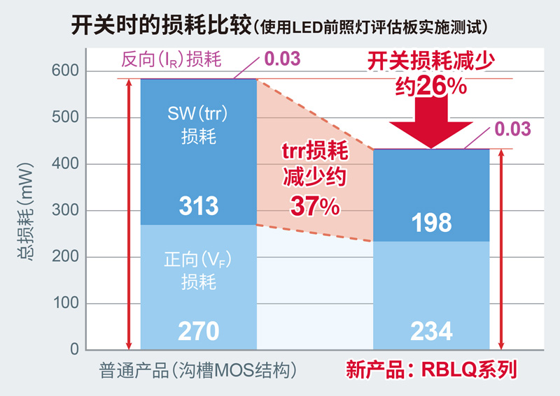 在普通沟槽MOS结构中,寄生电容(元器件中的电阻分量)较大,因此trr要比平面结构差。而RBLQ系列和RLQ系列新产品不仅降低了VF和IR,而且还利用自有技术,通过优化材料,实现了与平面结构同等的trr特性。例如,从图7中可以看到使用LED前照灯评估板进行装机评估时的开关损耗比较情况。在开关过程中,因VF和trr引起的损耗比例比较高,但RBLQ系列和RLQ系列的trr损耗降低了约37%,VF也同时降低,因此开关总损耗降低达26%,这将有助于降低车载LED前照灯驱动电路、以及xEV用的DC-DC转换器等需要进行高速开关的应用产品功耗。