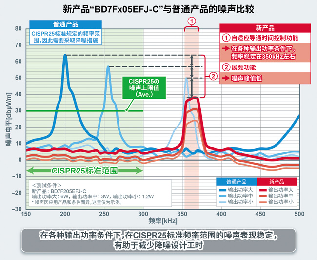 通过采用ROHM所擅长的模拟设计技术,在检测二次侧的电压和电流方面,新产品无需以往产品所需的光电耦合器※3或变压器的辅助绕组以及外围部件。由此,可以在改善光电耦合器的课题如检测精度受功耗大小和温度的影响,年久老化等的同时,减少元器件数量,实现产品的小型化。因此,与普通的反激式隔离电源的电路相比,可以削减光电耦合器和用于检测电流的外围元器件等10个部件,体现在电路板面积上时,能够削减30%左右的面积。此外,由于新产品配备了自适应导通时间控制功能,可以固定开关导通时间,所以无论是在哪种输出功率状态下,开关频率都能稳定在350kHz左右。通常,在应对汽车电子电磁兼容EMC标准CISPR25※4时,往往需要针对150kHz~300kHz频段采取降噪措施,而此次开发出的新产品因为没有涉及到该频段范围,所以应用产品的降噪工作将更加轻松。这些优势再加上有助于降低辐射噪声的展频功能※5,可进一步减少降噪相关的设计工时。