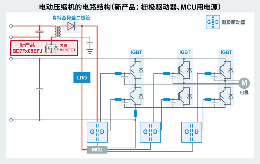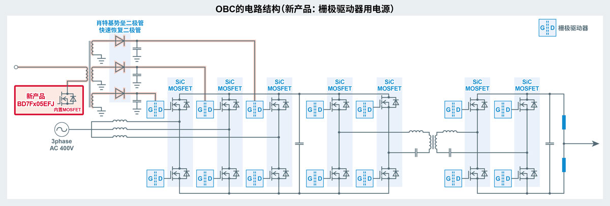 全球知名半导体制造商ROHM(总部位于日本京都市)开发出两款隔离型反激式※1DC-DC转换器“BD7F105EFJ-C”和“BD7F205EFJ-C”,新产品非常适用于xEV(电动汽车)的主驱逆变器、车载充电器(以下简称“OBC”)、电动压缩机以及PTC加热器※2等应用中配备的栅极驱动器的驱动电源。