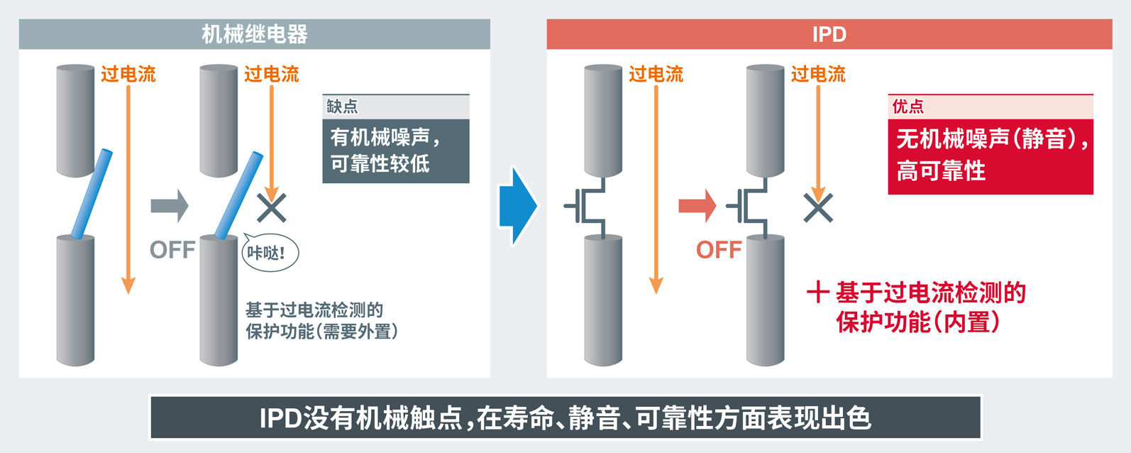 - 不仅可控制电子电路的ON/OFF,还可以保护电路免受电气故障(异常时的过电流)影响的器件。与传统的机械继电器不同,这种器件没有机械触点,因此在寿命、可靠性和静音方面都表现出色。另外,MOSFET作为普通的半导体开关器件,可能会因过电流而损坏,而IPD则内置保护功能,可以用来构建更安全和更高可靠性的系统。