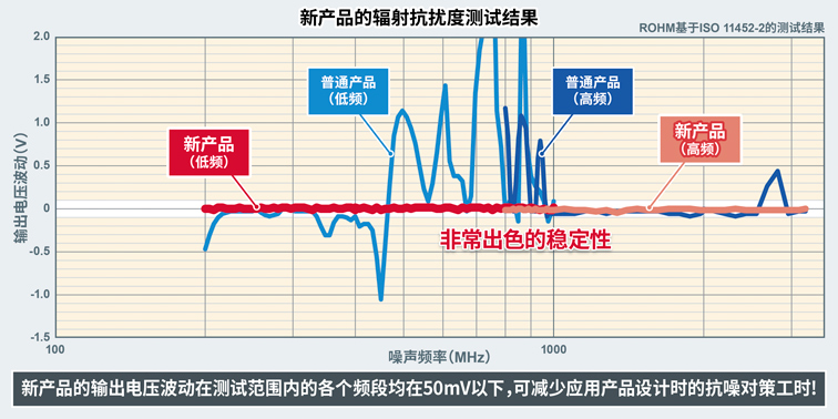不仅如此,新产品还具有出色的抗干扰能力,在 ISO 11452-2辐射抗扰度测试(用来评估抗干扰能力的国际标准)中,在测试范围内的各个频段,输出电压波动量均在50mV以下(±1%以内),因此可以减少应用产品设计时的抗噪对策工时。
