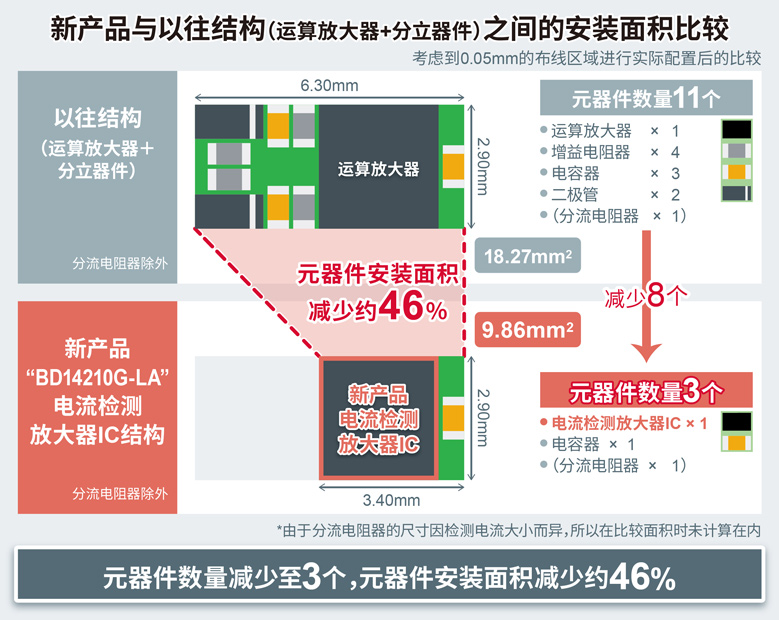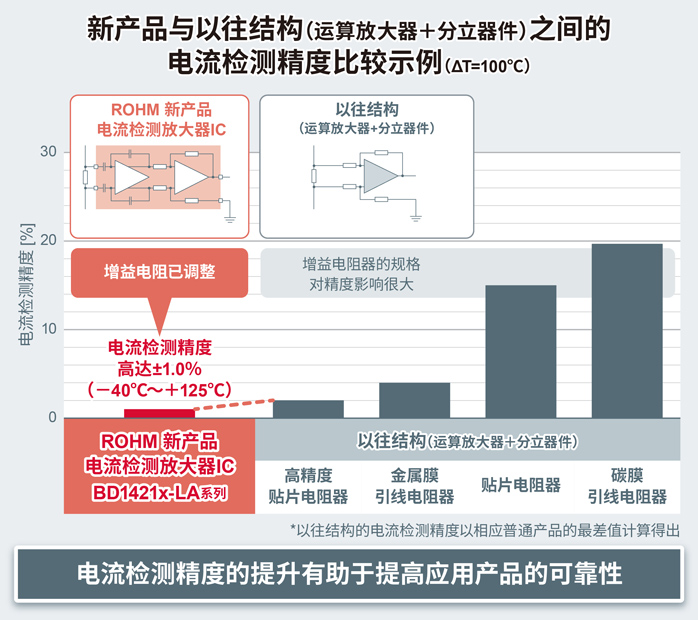 近年来,越来越多的应用产品需要具备电流检测功能。例如,要想改善电机效率和实现异常检测等目标,就需要提高电流检测精度。另外,还需要减少安装面积。在以往结构(运算放大器+分立器件)中,存在元器件精度波动和温度特性导致电流检测精度下降、很难缩小安装面积等问题。为了解决这些问题,ROHM利用长年积累的模拟技术优势,开发出更节省空间且能高精度检测电流的新产品“BD1421x-LA系列”。