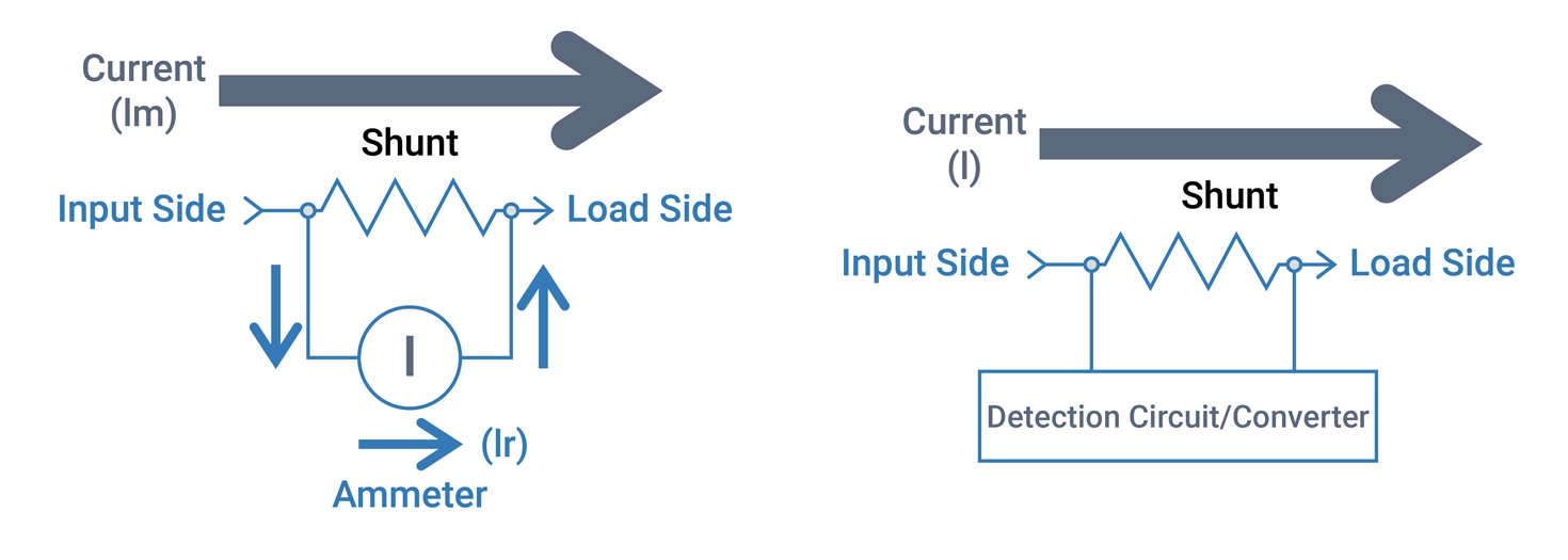 电路中的电流检测技术多种多样。其中最简单和最常见的方法之一是使用专用的检流电阻器。如下图所示,这种电阻器有两种用法。其一是图左侧的分流配置,其中大部分电流流经检流电阻器,而已知比例的电流流经电流表。该比例是已知电流表电阻和已知分流电阻的比例函数,因此可以计算出电路中的总电流。其二是图右侧的串联感测拓扑结构,其中所有电流都流经阻值较低的检流电阻器,再用高阻抗万用表测量其两端的电压。这样,电路中的总电流就可以运用欧姆定律轻松计算出来。
