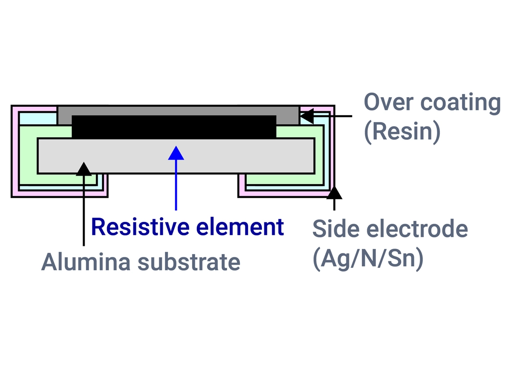 检流电阻器有两种不同的制造方式。第一种是基于传统的厚膜电阻结构,如下图所示,即在陶瓷衬底上印刷电阻膏经过烧结后,用激光调阻使电阻达到目标阻值,再经过涂装和组装,最终制成表面贴装型电阻器。