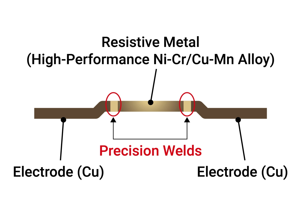 第二种方式是使用金属合金作为电阻结构,将其直接焊接到接触电极上。合金配方对于确定阻值及其热特性至关重要。这种电阻结构具有出色的功率和热性能表现,但其制造成本较高。下图给出了一个示例。