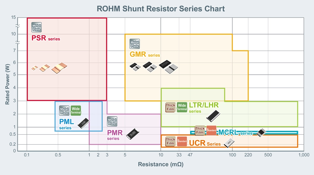 ROHM提供了丰富的产品阵容,可以满足各种应用对额定功率和电阻值等性能变量的不同需求。下图展示了ROHM的各系列分流电阻器及其性能范围。