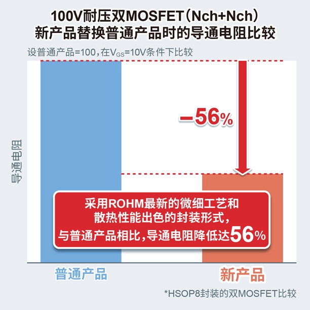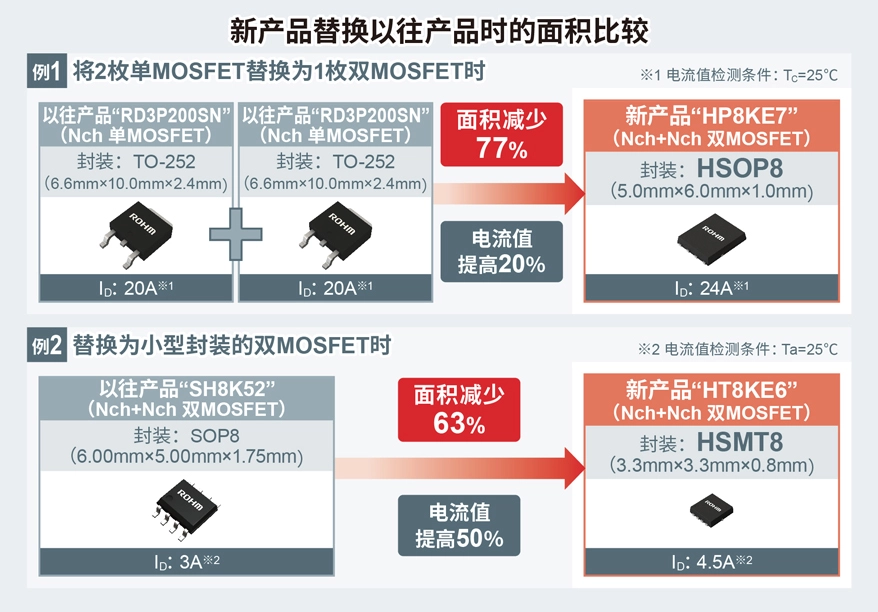 新产品通过采用ROHM新工艺和背面散热封装,实现了业界超低的导通电阻(Ron)*3(Nch+Nch产品为HSOP8:19.6mΩ、HSMT8:57.0mΩ)。与普通的双MOSFET相比,导通电阻降低达56%,非常有助于进一步降低应用设备的功耗。另外,通过将两枚芯片一体化封装,可以减少安装面积,有助于应用设备进一步节省空间。例如HSOP8封装的产品,如果替换掉两枚单MOSFET(仅内置1枚芯片的TO-252封装),可以减少77%的安装面积。