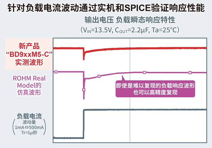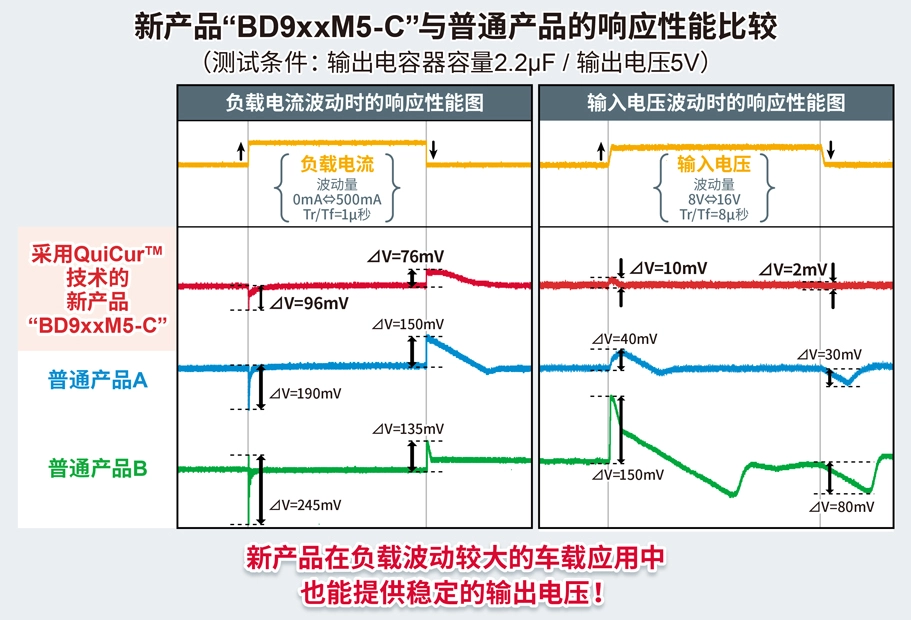 新产品采用ROHM的高速负载响应技术“QuiCur™”,对负载电流*3波动具有优异的响应特性。因此,即使在输入电压或负载电流波动时,也能实现应用产品所需的稳定工作(输出电压波动100mV以内:负载电流波动0mA⇔500mA Tr/Tf=1μ秒)。另外,还实现了消耗电流仅为9.5µA(Typ.值)的低电流工作,有助于降低车载应用的功耗。不仅如此,新产品还计划提供四种封装形式,包括小型HTSOP-J8封装、散热性能出色的TO252封装(TO252-3/TO252-5)和HRP5封装,客户可根据使用环境灵活选用。