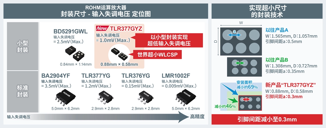 造成运算放大器误差的因素通常包括“输入失调电压”*1和“噪声”。两者都是与放大精度相关的项目,都可以通过扩大内置晶体管尺寸得到抑制,然而这又涉及到与小型化之间的权衡关系。通过嵌入利用ROHM自有电路设计技术开发出来的失调电压校正电路,新产品在保持晶体管尺寸不变的前提下实现了最高仅1mV的低输入失调电压。另外,新产品不仅利用ROHM自有的工艺技术改善了常见的闪烁噪声*2,还通过从元件层面重新调整电阻分量,实现了超低噪声,等效输入噪声电压密度*3仅为12nV/√Hz。此外,新产品采用了WLCSP(Wafer Level Chip Size Package)封装,该封装利用ROHM自有的封装技术将引脚间距减小到了0.3mm。与以往产品相比,尺寸减小了约69%;与以往的小型产品相比,尺寸减小了约46%。