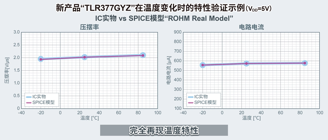 在新产品验证用的仿真模型中,利用ROHM自有的建模技术,忠实地再现了实际IC的电气特性和温度特性,成功地使仿真值与IC实物的值完全一致。ROHM提供这种高精度SPICE模型“ROHM Real Model”,通过可靠的验证,可有效防止实际试制后的返工等情况发生,有助于提高应用产品的开发效率。