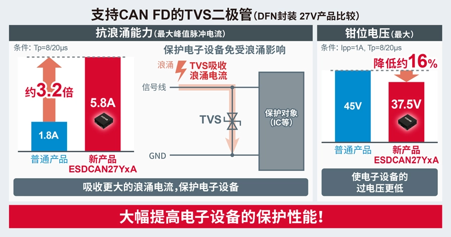 新产品通过优化元件结构,将引脚间电容*3降至最大3.5pF,可防止高速通信时的信号劣化。另外还实现了出色的抗浪涌特性,大大提高了车载环境中电子设备的保护性能。例如,DFN1010封装的支持27V的新产品,与支持CAN FD的同等普通产品相比,抗浪涌能力*4提高了约3.2倍,钳位电压*5也降低了约16%。这可以有效地保护车载ECU等昂贵且对浪涌敏感的电子设备,即使在严苛的车载环境中也能提供高可靠性。