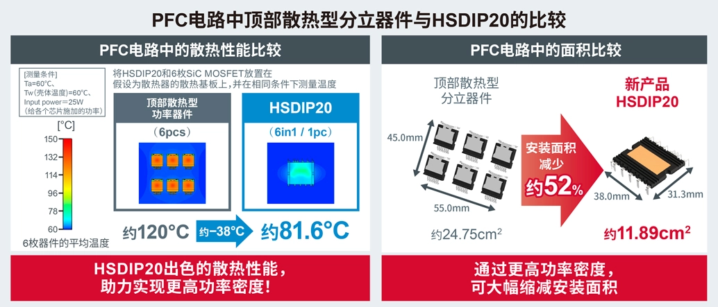 HSDIP20内置有散热性能优异的绝缘基板,即使大功率工作时也可有效抑制芯片的温升。事实上,在OBC常用的PFC电路(采用6枚SiC MOSFET)中,使用6枚顶部散热型分立器件与使用1枚6in1结构的HSDIP20模块在相同条件下进行比较后发现,HSDIP20的温度比分立结构低约38℃(25W工作时)。这种出色的散热性能使得该产品以很小的封装即可应对大电流需求。另外,与顶部散热型分立器件相比,HSDIP20的电流密度达到3倍以上;与同类型DIP模块相比,电流密度高达1.4倍以上,达到业界先进水平。因此,在上述PFC电路中,HSDIP20的安装面积与顶部散热型分立器件相比可减少约52%,这非常有利于实现OBC等应用中电力变换电路的小型化。
