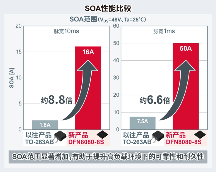 RY7P250BM为8×8mm尺寸的MOSFET,预计该尺寸产品未来需求将不断增长,可以轻松替代现有产品。另外,新产品同时实现了更宽SOA范围*3(条件:VDS=48V、Pw=1ms/10ms)和更低导通电阻(RDS(on))*4,由此既可确保热插拔(电源启动)工作时的更高产品可靠性,又能优化电源效率,降低功耗并减少发热量。