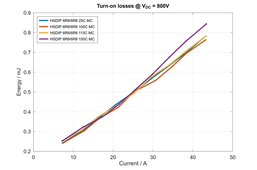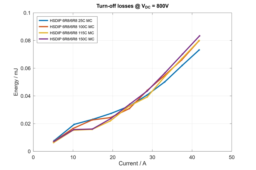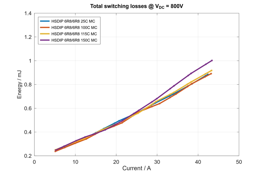 图2:在800V直流链路电压下,HSDIP模块在不同温度下的开通和关断损耗