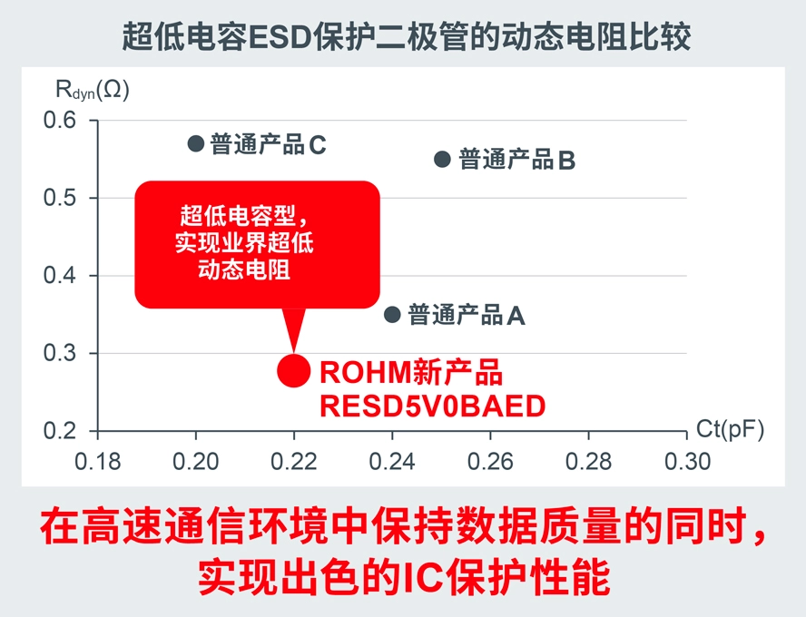 对此,ROHM推出了能够解决这一课题、并支持更高速通信的RESDxVx系列产品,新产品不仅实现更低电容,还实现更低的动态电阻。超过10Gbps的高速通信接口,需要可将信号劣化控制在更低且具备出色IC保护性能的ESD保护二极管。新产品实现引脚间电容*3仅为0.24pF(双向)和0.48pF(单向)的超低电容特性。同时,与该特性存在权衡关系的动态电阻也降低至0.28Ω。与普通产品相比,其钳位电压*4降低了约40%,确保了优异的IC保护性能。